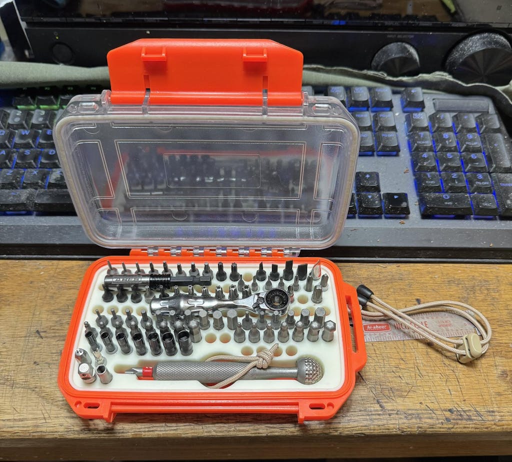 I reversed the silicone holder in the case and removed the black foam liner. Also sawed off and filed down the left side "bracket". Added a mini ratchet and locking bit holder extension. The loop around the screwdriver is to pull it out easily and the silicone doesn't collapse in when it's removed as I glued it in place. I put in my Ti driver in place of the brass that came with it.