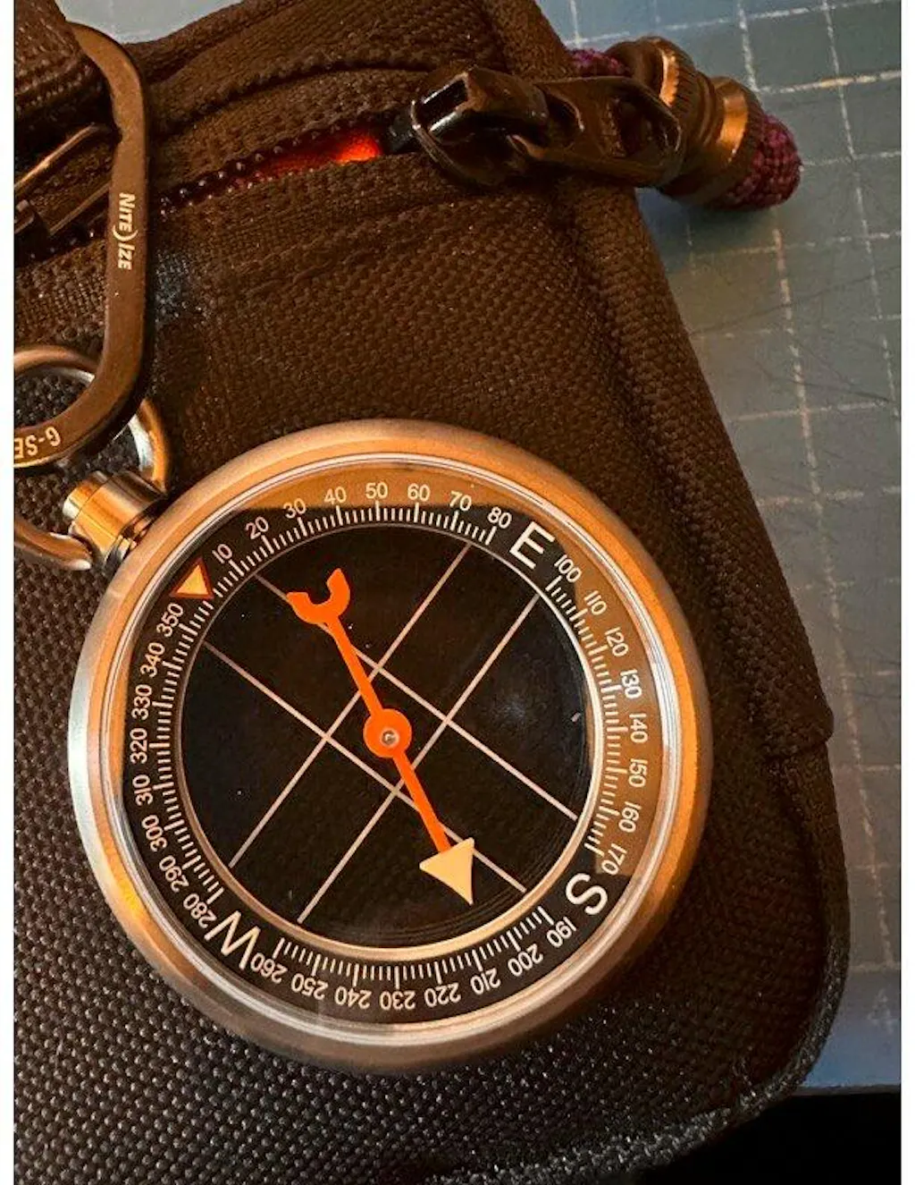 The frame is made from a single piece of grade 5 titanium. The top bail is free spinning titanium for easy carry and will not bunch up in your pocket. This design is perfect for laying on a map to see through to your declination.