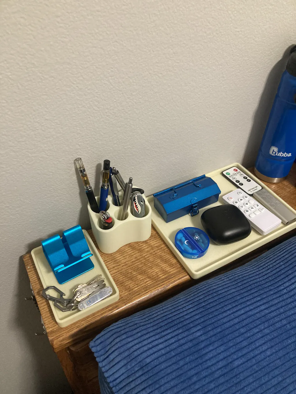 Good way to keep all the little but commonly used tools handy, but organized better than just a cup. The curved edges also nest nicely against pencil holder cups, giving some extra options, stabilizing lighter weight cups, etc. Tweezers can be hung over the edge, one jaw in, one jaw out.