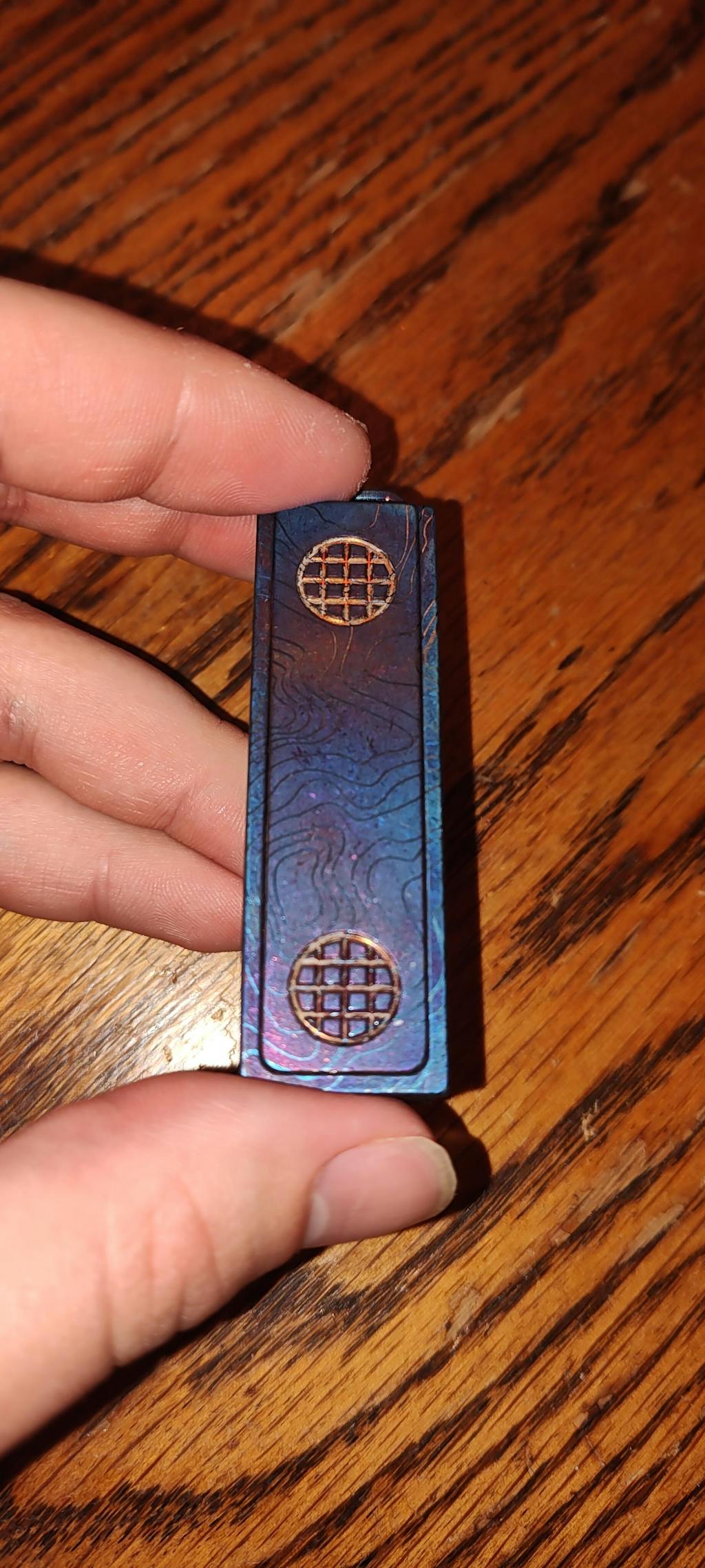 This incredible machined titanium Match Slide Box has a spring-loaded plunger securing the machined top. The top has been laser engraved with a topographical map pattern.