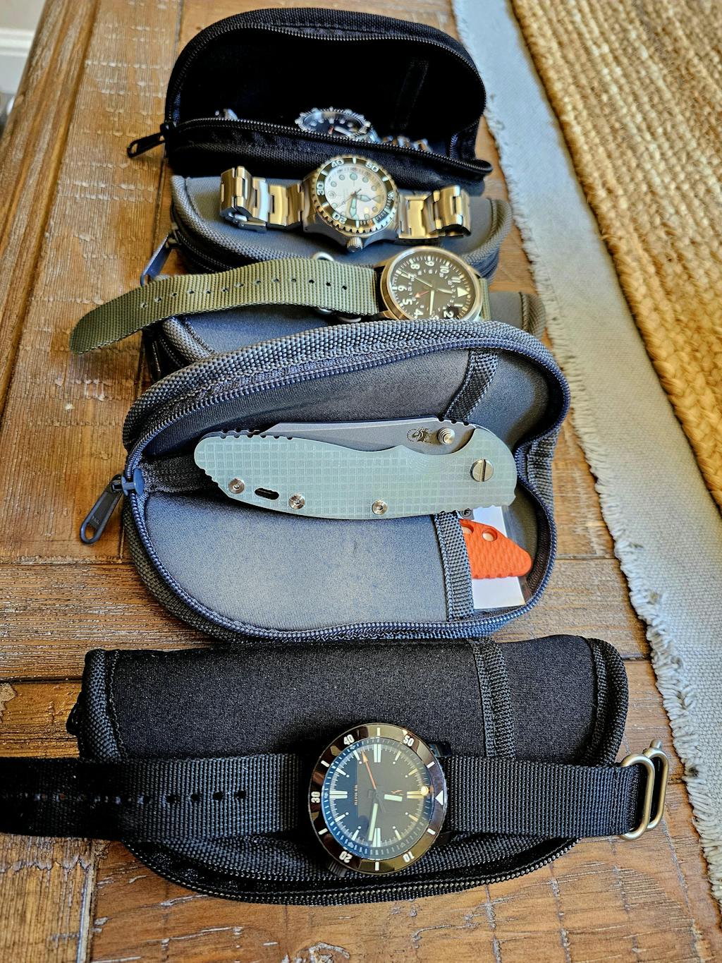 My first exposure to these little cases was with the purchase of a Maratac watch. With the addition of other watches and knives, these pouches have proved their worth organizing and protecting these small investments. The dividers within the cases are great for storing extra straps, scales and tools. Buy a few.....