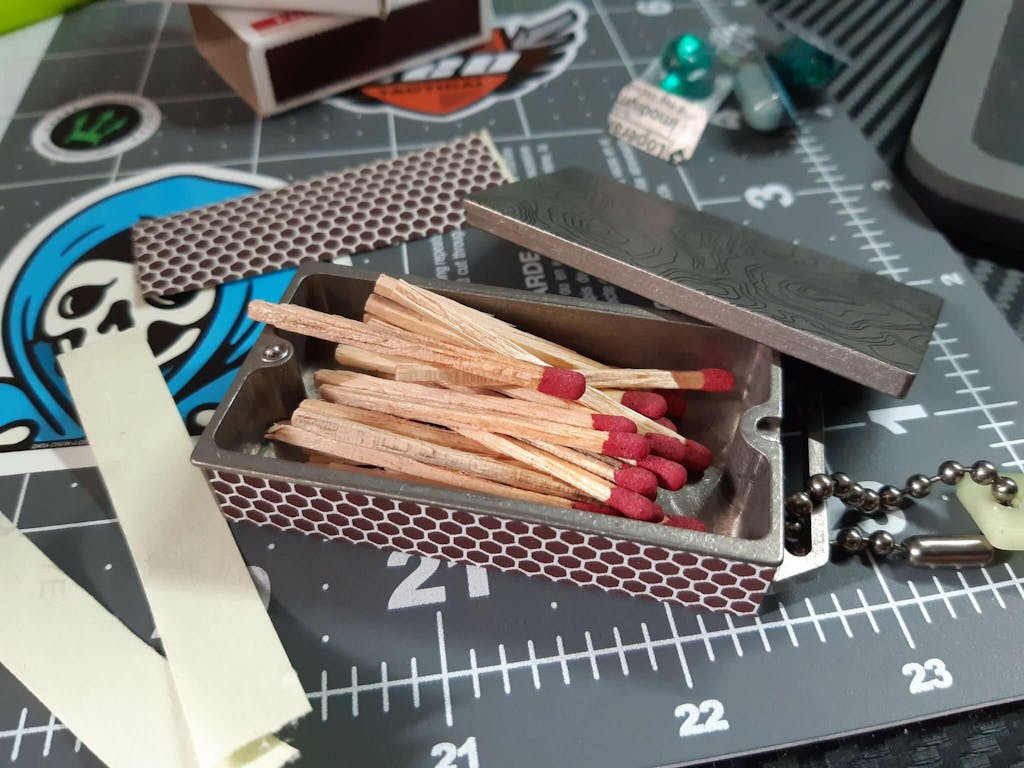 I bought the Titanium Slide Match box with loop. However, I wanted more matches to be stored, so I used this Titanium Strong Box to double the capacity, plus easy opening and closing of the lid. I am happy with the outcome. The coolness factor of this Ti matchbox is really a head-turner inside a bar.