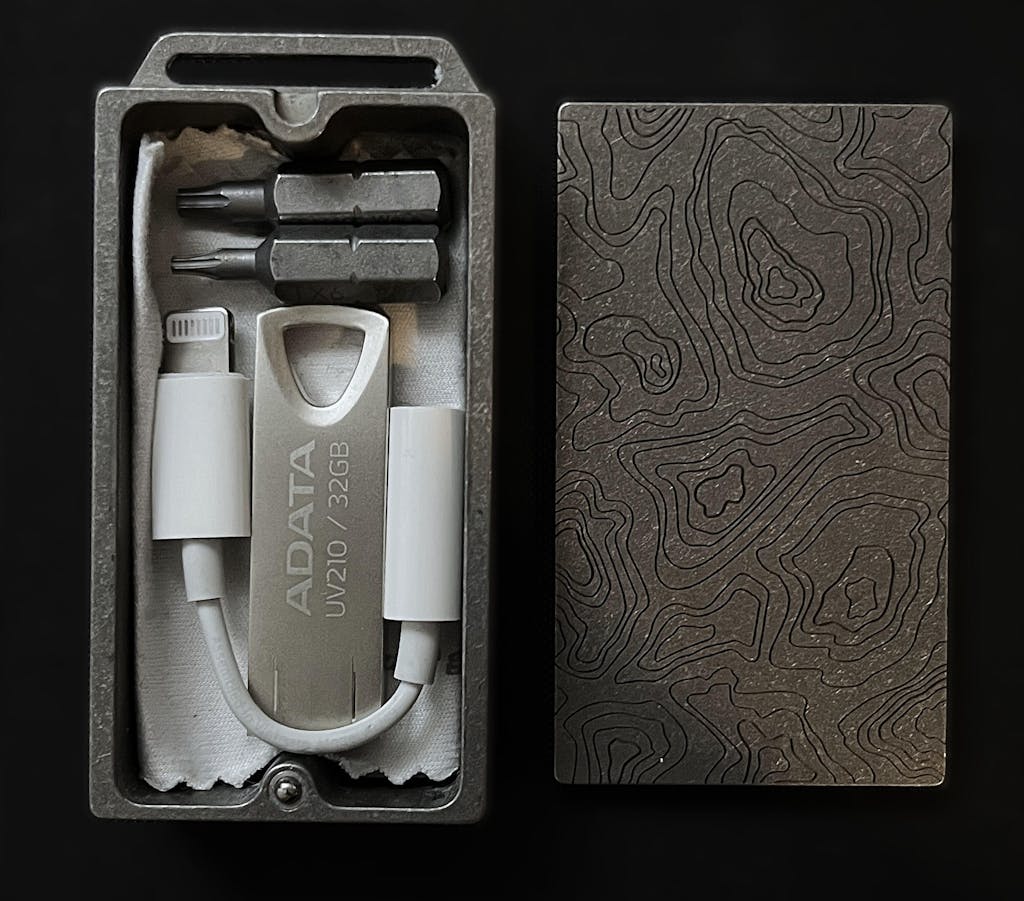 This handsome machined titanium slide box has a spring-loaded plunger securing the machined top. The top has been laser engraved with a topographical map pattern.Perfect for keeping your little goodies safe Strength tested with 7500 lbs  F250 Super Duty on top!Outside...