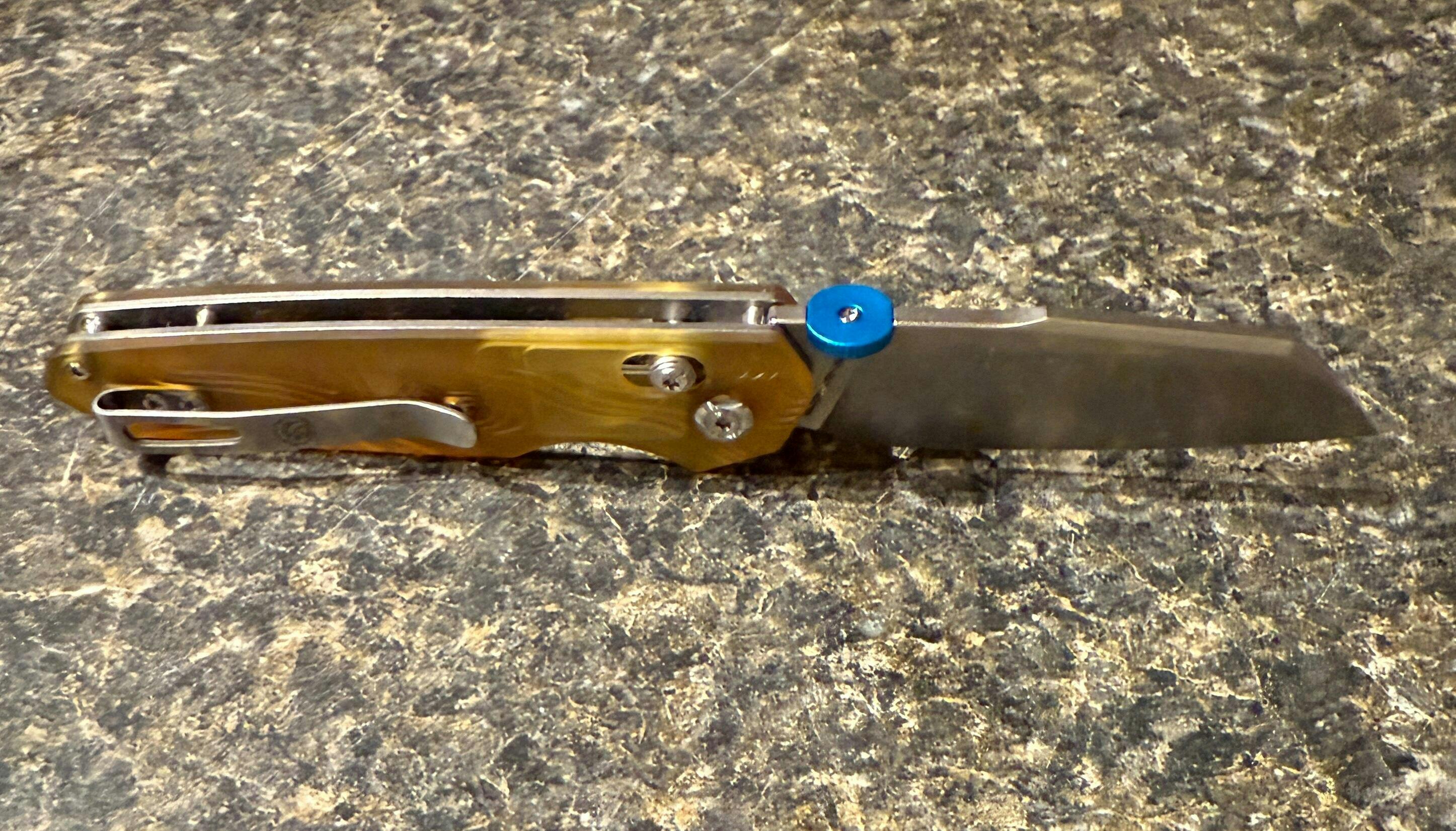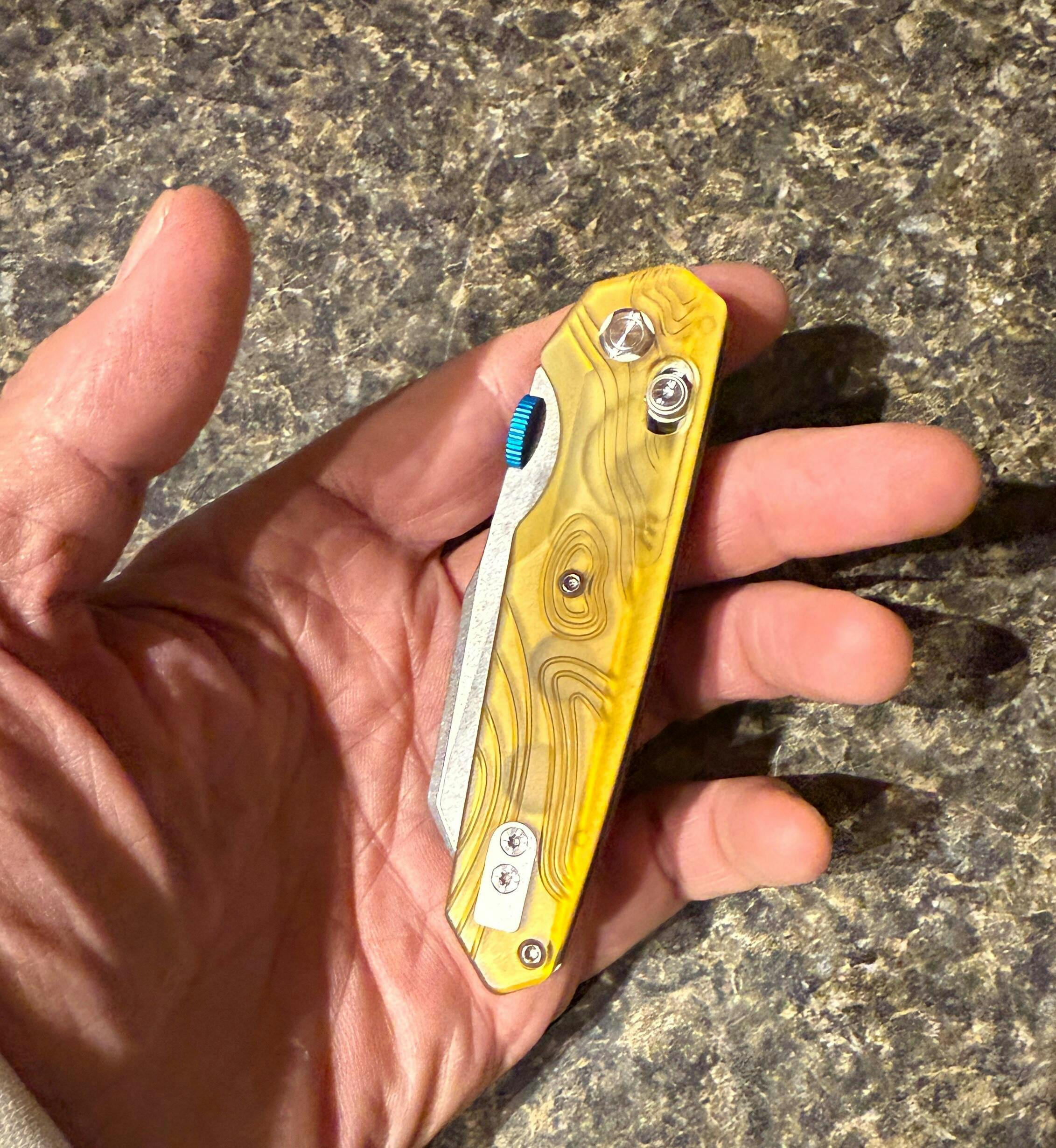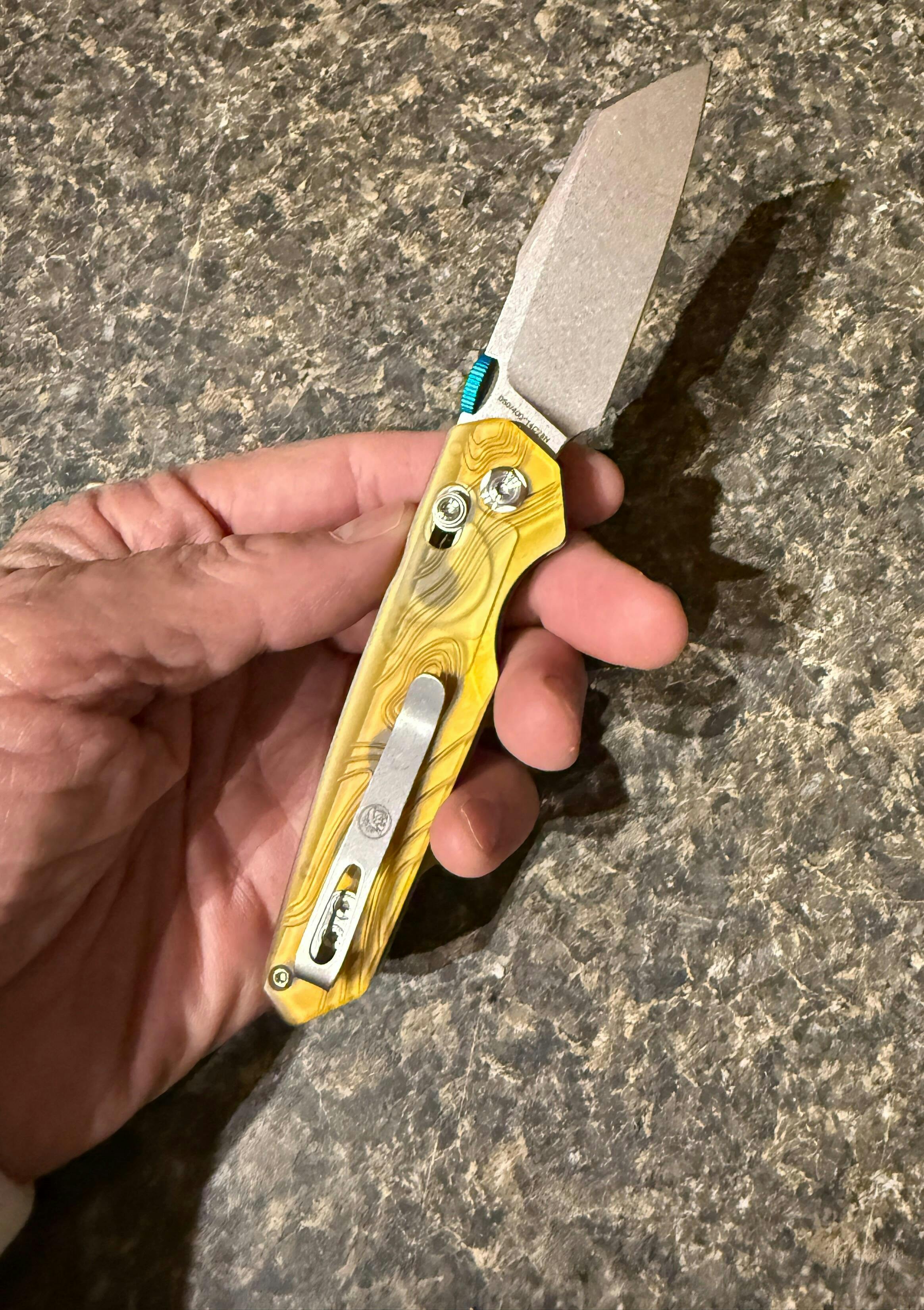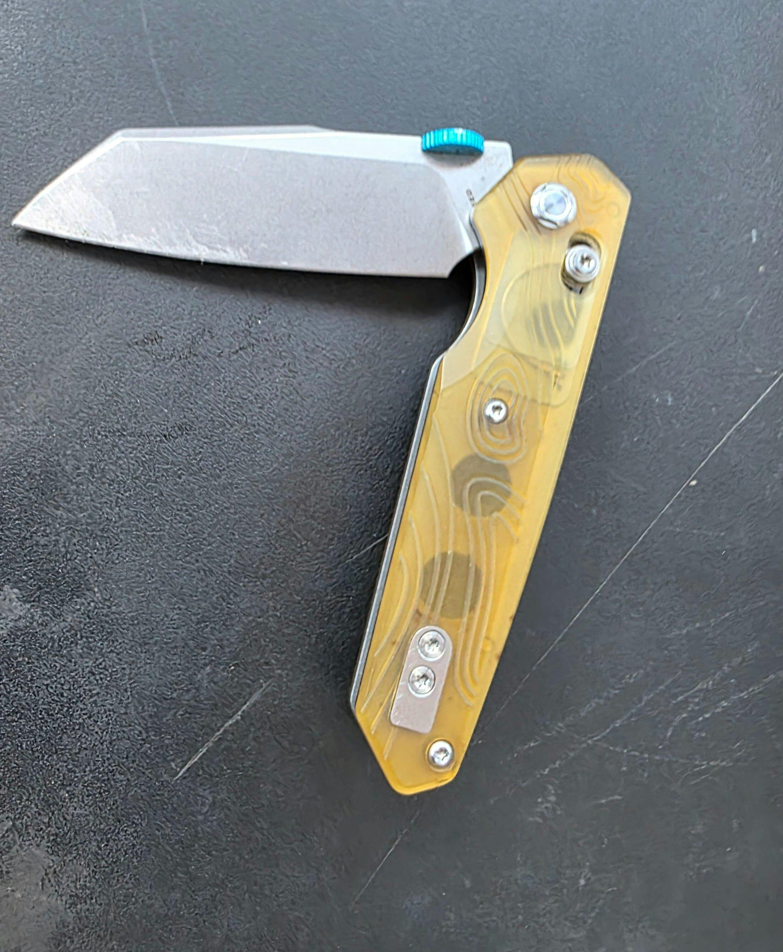 Ultem with topography pattern! And we sincerely wish you enjoy the sleek, modern, and ergonomic designs of the handle. In particular, the width, finger access, and finger choil are specially made for prolonged usage. On both sides of the handle, there will be pocket clip slots for ambidextrous carry.