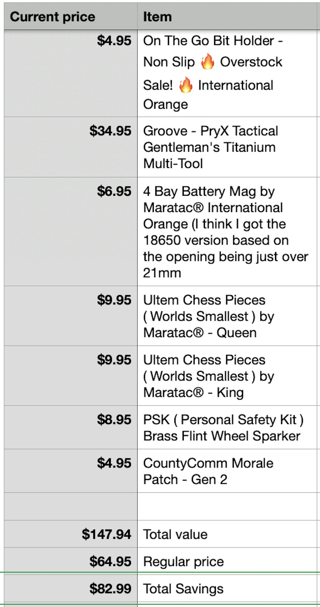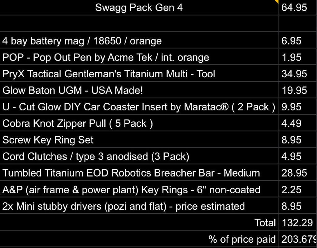 Very happy with this mystery pack and the assortment I received. This was part of my second order (my first hasn’t yet arrived yet) but the items compliment the choices I’d made previously. A good spread of functional and fun items that will definitely help shape my future purchase decisions. The glow baton, pry-bar and breacher bar are just awesome. Well thought out products, made to a high standard.