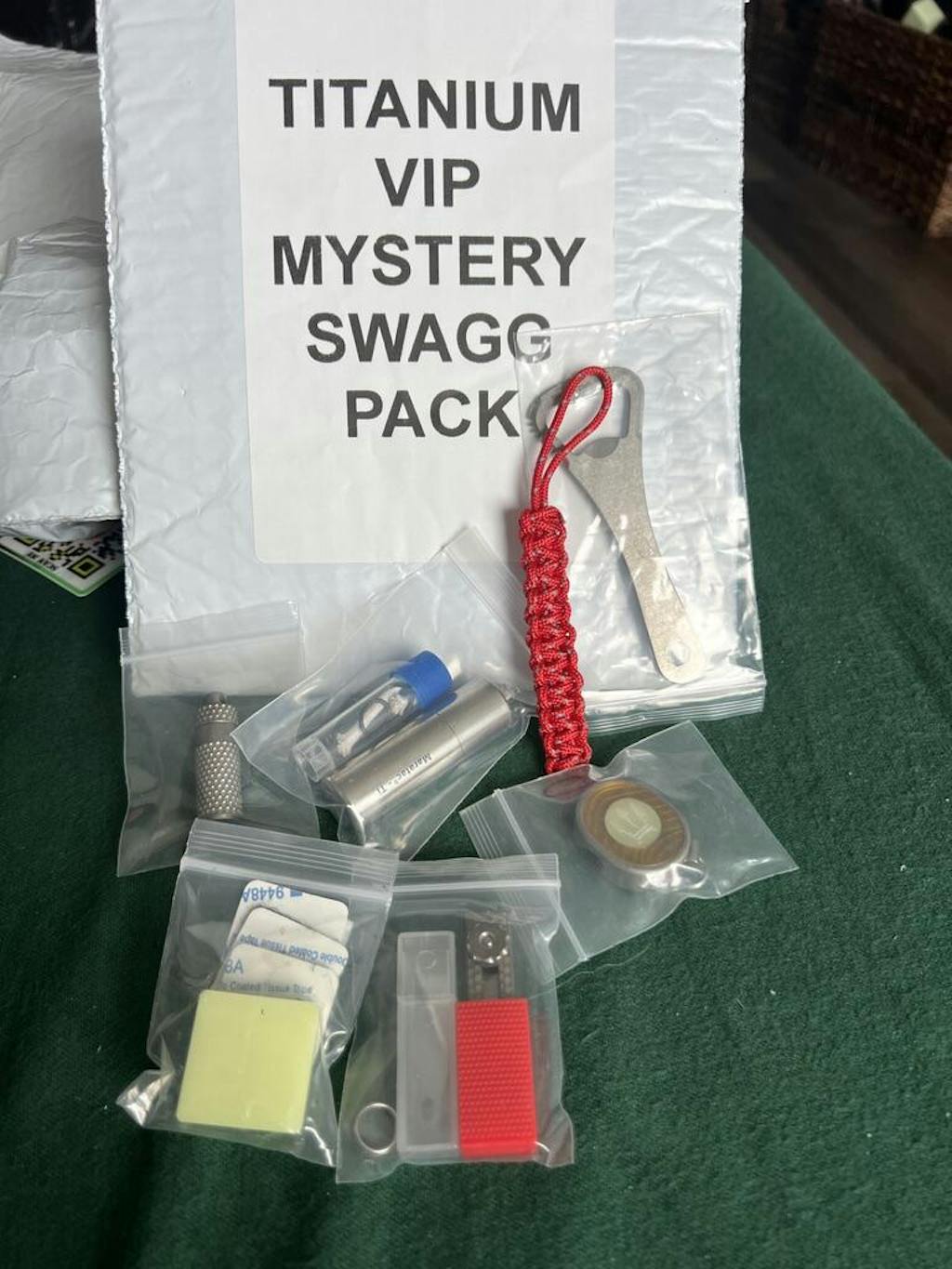 I received 3 bottles openers (I usually just use my lighter to open bottles, maybe I'll give them to friends) and a bolt action pen (surface seems rough, would have preferred it to be polished like other pens I've gotten from here), a kinda basic but holding pen (came with 2 bits, but there is no storage for the second bit), a mini lighter that's pretty cool (second one I've gotten, they haven't made it to my key ring due to it being bulky, but I think it will make the cut in the future. A decent assortment of items, I was hoping for a large breacher bar, but maybe next time.