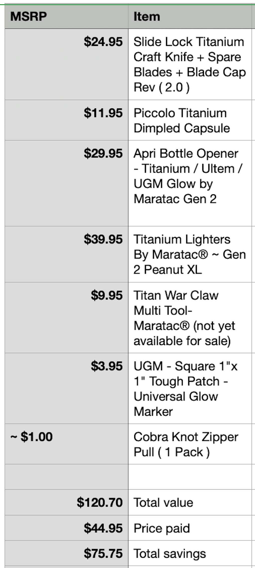 For the price, was a great deal. I got a titanium top, tube-a-ton, and several smaller titanium items. Very happy with it for the price!