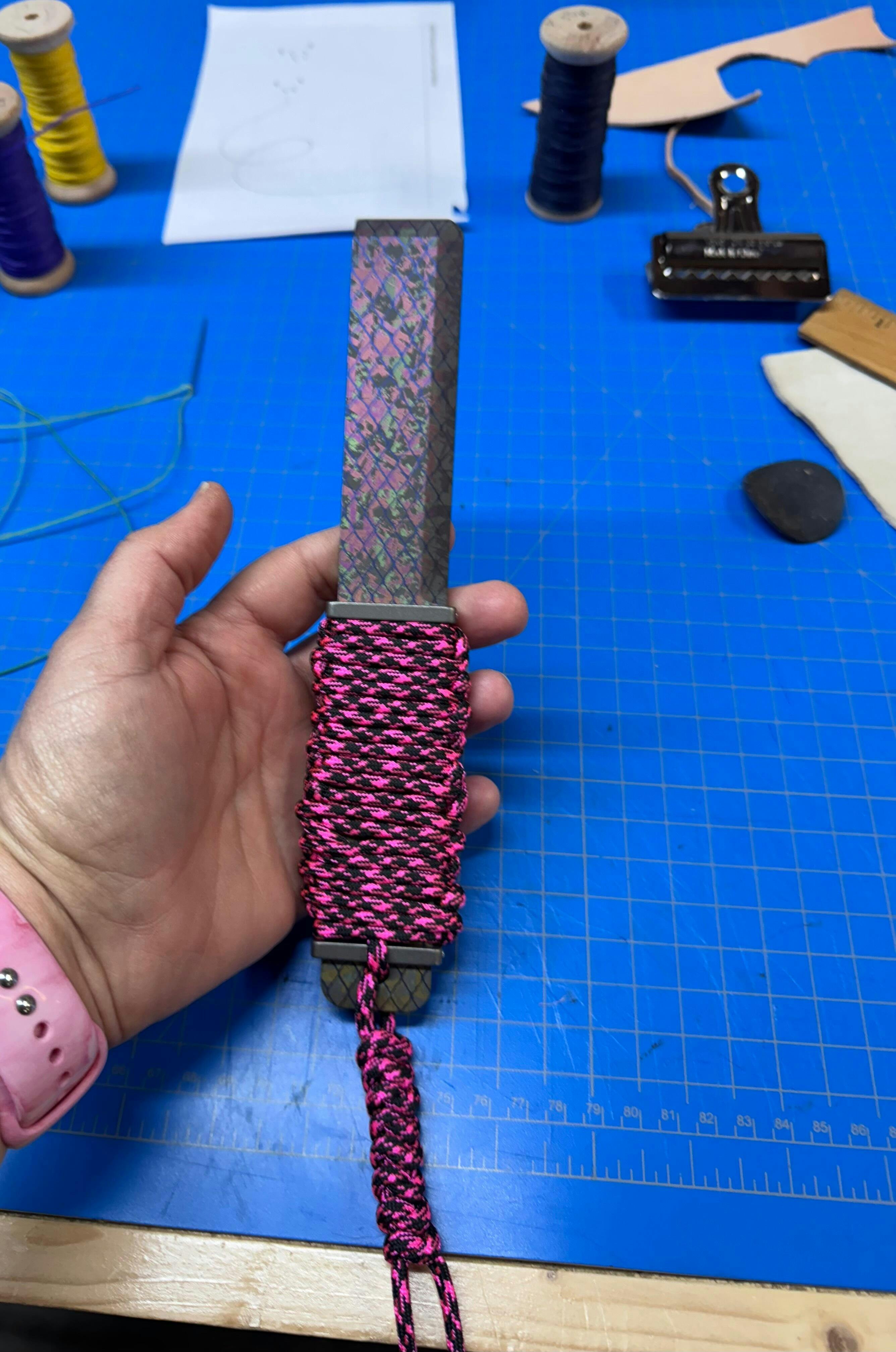 - The 2 inner holes in the handle can be for paracord or solid slabs or whatever you like. The hole towards the top of the blade and the one on the end are good for lashing it onto a shaft, tree branch etc. The end hole is geared for hanging it up or for attaching a lanyard so you do not lose it in that pit or in the water.