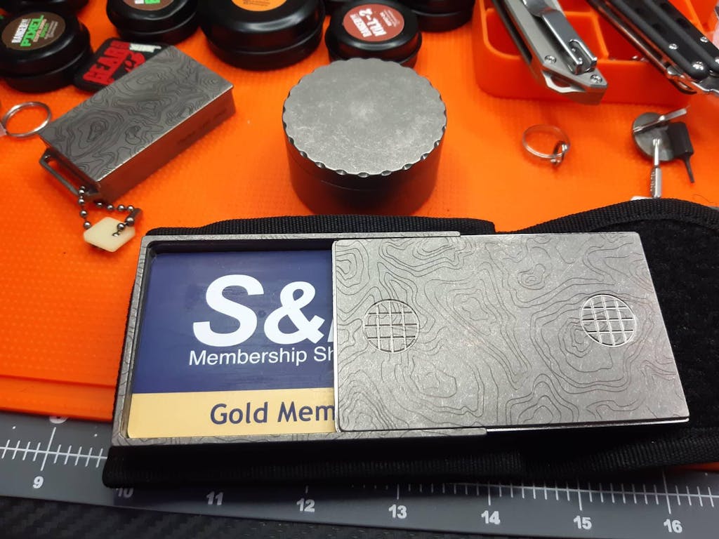 The Slide Top Carbon Finer Card Holder is engineered to fit 7-8 of your credit cards or business cards when on the move. If you’re a true minimalist and only have 4-5 cards you can easily stash some cash or keys inside to make this a fully concealed wallet. The other big perk of this design  based on its size is that you can easily fit pills, cord, bandaids, blades, keys, compass, and more inside too.