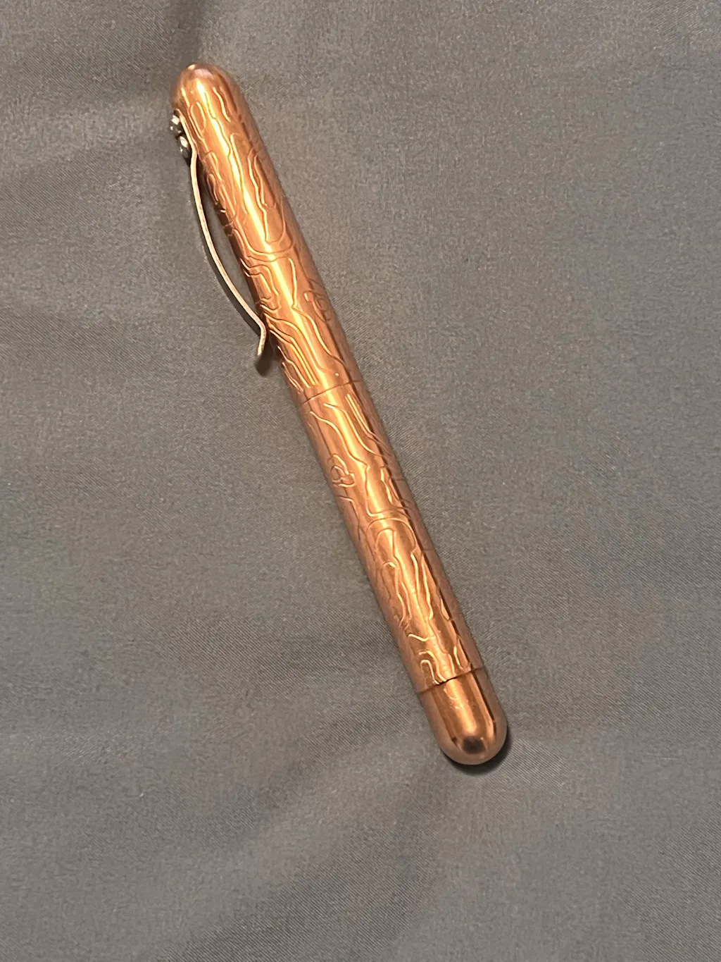 Copper is always cool! A pen with heft. The Topo pattern on this pen makes it easy to hold onto, not to mention unique. Love this one it’s my third Embassy, I have a titanium and a blue aluminum. The ink refill is good however twice so far it had some ink globed on this tip when I used it. Great pen regardless.