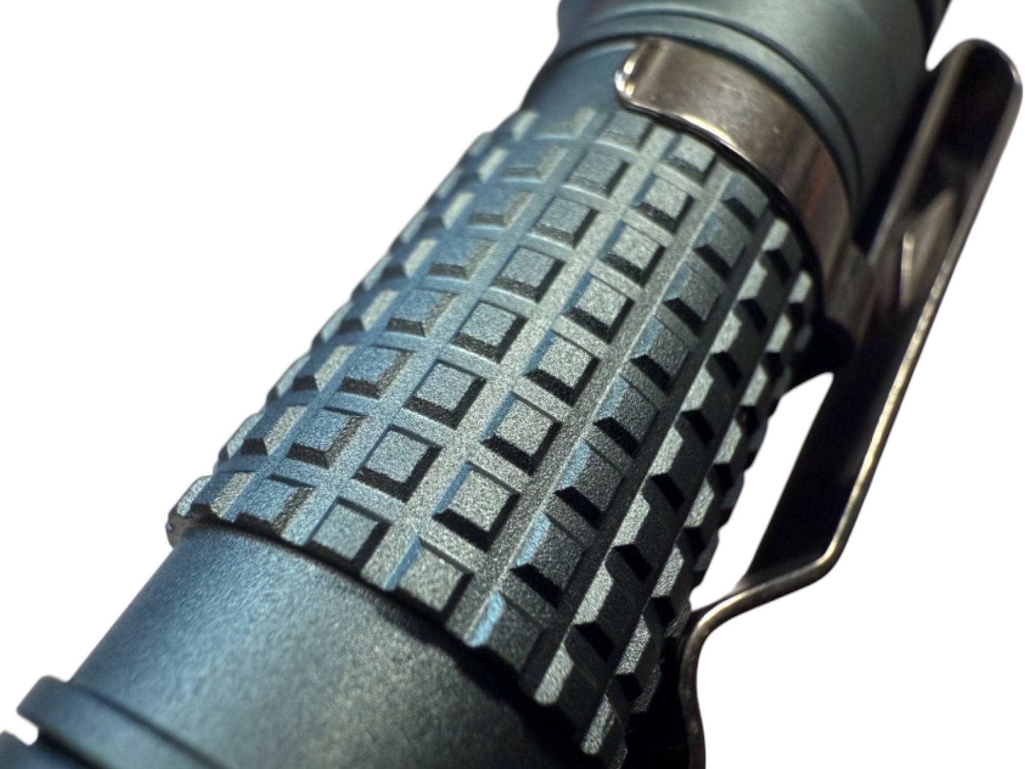 - Made by aircraft-grade 6061-T6 aluminum alloy and 304 stainless steel. The whole shell (head, body tube and tail) surface have Type-III hard-anodized process for good durability and corrosion resistance. The whole head shell is precisely CNC machined from a single block of aluminum for better heat dissipation and rugged construction. The aggressive style knurling on the body tube and the tail are precisely CNC machined for perfect grip. The whole shell and screw-on bezels surrounding button & TIR lens have bead blasted process, the bottom of the tail and surrounding the button are precisely filleted for a comfortable hand-touch feeling.