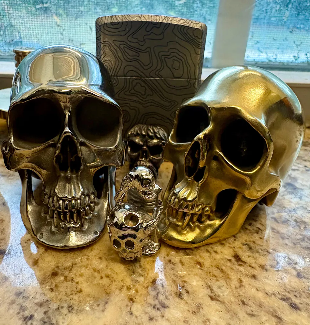 One of our cadre with over 20 years of jewelry experience custom made the skull inspired by his passion and appreciation for mausoleum skulls. You really have to hold one of these in your own hand to appreciate the craftsmanship and attention to detail. Skulls can be heat treated to create a unique coloring effect. The skull can be drilled in any direction to form a cord clutch, lanyard or even drawer pull.